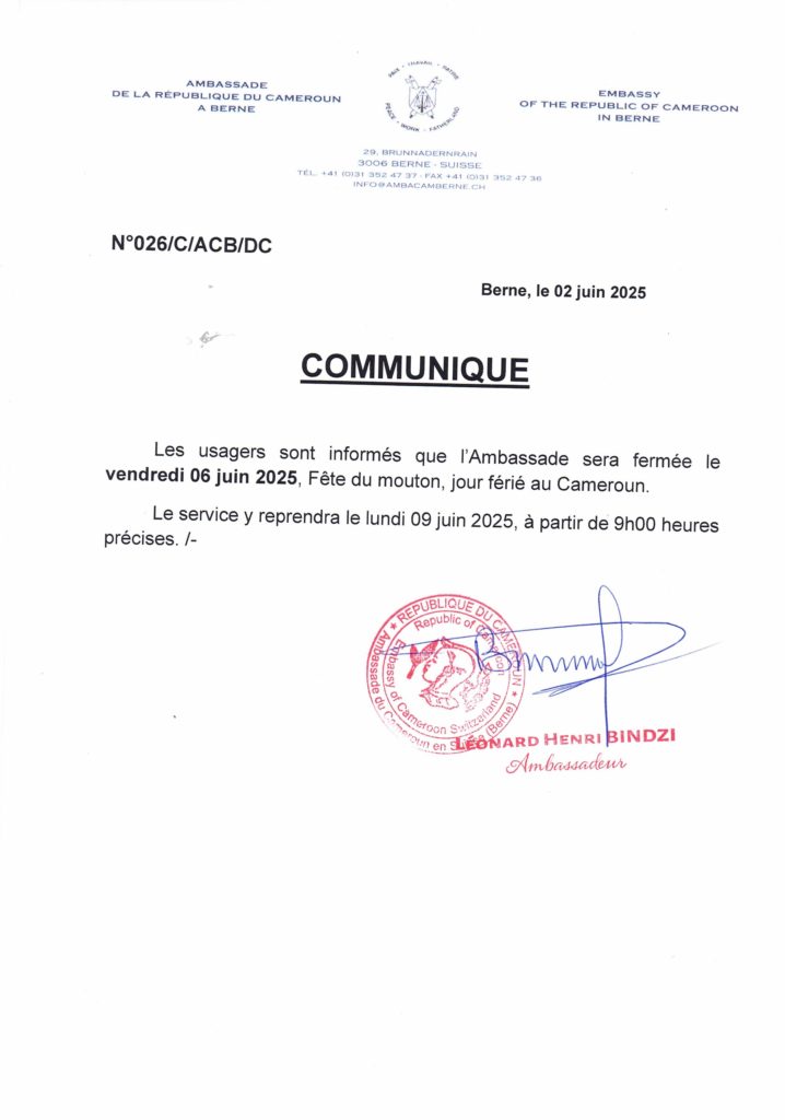 Communiqués jours fériés Fête nationale du Cameroun 2025