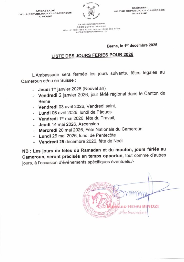 Communiqués jours fériés Fête nationale du Cameroun 2025